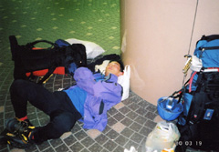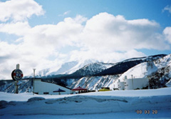 | 3/20 稚内に着く直前に車窓から島が見えた! 藤田はこの時点ですでに舞い上がってしまう。 【この時点でまだ気持ち悪くお茶と水ばっか飲んでました...ほんにだめだわ】 フェリーにて鴛泊へ。 交番で登山届けを出すが、目的が「南稜」であることが判明したとたん、延々とお説教を食らう。 去年の今頃秀峰山岳会の2人がヘリでピックアップされており、神経質になっているのだ。 |