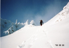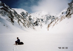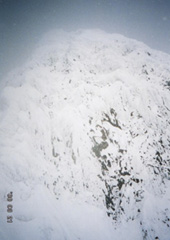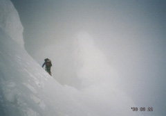 | 起床直前にションベンに出た森崎に天気を聞くと、「ガスガスで、積雪10cm位っす」。 現実を認めたくない藤田は出発する直前まで森崎のいつもの冗談だと思っていた。 【今おもえば少し強気にこういったものの20cm以上はらくしょーでつもっとった...】 視界は50m位。 風は弱いが雪はどんどん降り積もる。 「うぅ〜む。帰らんでエエのか?」 出発していきなり雪稜が吸収され、斜面をいく。 昨日に引き続き、パウダースノーの下の雪も締まっておらず、いゃ〜なラッセルを強いられる。 |