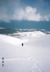 | 利尻の北側はうって変わってなだらかな雪面となっている。 頂上直下で迷いやすい部分もあるが、下降するにつれ視界もきき、浮き浮き気分で下山する。 最後の樹林帯をさまよい歩き、車道に出たのは利尻温泉のすぐ上であった。 【山頂手前では雪の深さに苦しめられ,下に行ったらさまようさまよう...俺はほんとにワンゲラーだったのか?情けない】 鴛泊で駐在のおっちゃんとだべった後、最終のフェリーで稚内へ。 「稚内では毛ガニがうまいよ」と春日井の宝石商に言われていたが、『本日トンカツ&焼き肉定食半額!』になんらいつもと変わらない飯を食ってしまった。 利尻を登った感動がまずいトンカツで汚されていく…。 再び特急「利尻」に乗り、一路札幌へ。 【こんなこと言われると心残りが...しかし特急利尻はほんにもう飽きた(寝てんだけどね)】 |