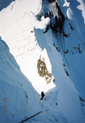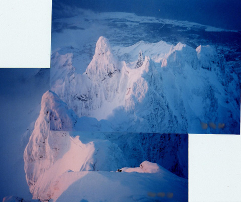 | 正面の浅いルンゼ状にはエビの尻尾がべったり。 右(ヤムナイ側)に回り込むと大きなルンゼが入っている。 懸垂5mからルンゼを藤田が25m登り返す。 雪はばさばさと落ちるが、雪質が軽いので雪崩にもってかれる心配は少ない。 ナイフリッジが終了するところにうまく出る。 ここからマオヤニ側に乗っ越し、森崎が50mめいっぱいトラバース。 続けてP2の基部に向かって藤田が40m。 基部から不安定なきのこ雪の雪稜を森崎が30m。 |