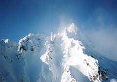 | このころから、上部にかかっていた雲がきれ、大槍やバットレスが見える。 「うぉ〜なんじゃありゃ〜」 標高差は僅か500mちょっとというのに、そのでかいことでかいこと。 低温による霜ザラメのせいでステップが決まりにくい。 雪面のトラバースなど、結構緊張する。 pk1200をすぎていきなり急峻になる雪稜を及び腰で進み、懸垂20m。 |