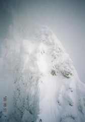 | いよいよ来てしまいました、問題のP2。 スコップで支点を掘り返し、懸垂15m。 さらに岩を支点に懸垂25m。 登り返しは絶対無理なボロボロの垂壁。 ガスの切れ間にバットレスの偉容が… 「あれを登らな生きて帰れんのか〜」 ロープを引き抜くときはほんまに泣きそう。 |