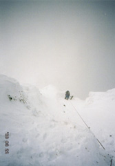 | 朝一で気の毒だが森崎が40m。 いきなり悪い草付き雪壁。 このころには再びガスってくる。 続くルンゼを藤田が40m。 ピンが貧弱で緊張する。 雪壁を森崎が20mあがり、尾根上に出てバットレス終了。 |