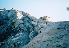 | 11pitch目(5.7) Large White Flake のトラバース。 やさしいところを行けばホントに簡単だが、その後のノブのフェースが怖い。 K 露出間バリバリでおっかない。 巨大フレークもちょこんと乗ってるだけだし。 |