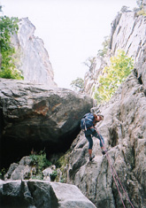 | 前が詰まっていたので3pitchまでで下降。 上で待っているときに下でリスが跳ねているのが見えた。 「おお、なんか尻尾をグルグル回して楽しそうやね、あのリス」なんてお気楽ムード。 ところが降りてきてみると、私のザックに大きな穴が・・・。 それまでみんなが「クソリスめ」と言っているのが不思議だった私もその瞬間から「クソリスめ!」と叫んでいました。。。 |
