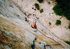 | K ミドルカシードラルのイーストバットレスは「北米クライミング50選」に入っているそうな。 蟻の攻撃がちくちくと痛かった。 エルキャプを眺めながらの楽しい登り。 なぜこうも適度なむずさが続くラインが存在できるのか? でも、上部の簡単なはずのクラック(5.6)の方が悪かったような。。 午後、Cetral Pillar of Frenzy(5.9)に行くが、今回唯一の順番待ちに疲れてしまい、3pitchで下降。 クライミング自体はとても面白かったが。 |