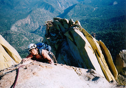 | 終了点からはマスターズオブストーン1でロンカウクが登っているタイタニック12cがよく見える。 近すぎて、広角レンズじゃないと収まりきらない。 とにかく美しい岩。 下降ラインがわかりづらく、ちょっと怖い懸垂をした。 |