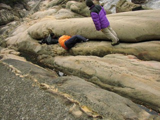 正月に大堂海岸を訪れた際、レスト日にみんなで立ち寄った竜串海中公園。 ところが私たちは、その通り道のすぐ近くに素晴らしいクラックに断ち割られた岩を発見してしまったのだ。 水族館見物はそっちのけで早速トライ。 2本の素晴らしいルートを拓くことができた。 岩質は、日本ではわりと珍しい砂岩。まだまだ開拓の余地はありそうで、今後が楽しみだ。 |