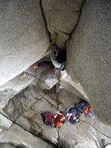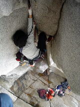 2日、前傾壁エリアへ。井土さんは11b/cのかぶったフィストクラック、私は11bの左上クラックにトライするがダメ。日下部さんは未登のチムニーを初登し、奥さんの待つ豊橋へと帰って行きました。