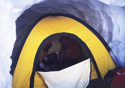 クーロアール付近で大休止を取っていると雲が切れ始め稜線が見え始める。 久々のシャッターチャンスなので2人には先に行ってもらいしばし撮影タイム。 クーロアールを越えると目の前に荒沢が凄い迫力で姿を現す。 ここでもしばし夢中でシャッターを切っていたが風が強い為、フィルム交換時ホルダーに雪が舞い込んで大変だった。 すっかり遅れをとったので全力で第二クーロアールを詰め天狗の鼻に到着。 時間は午後2時を回った位であった。 風が強いので相談の結果尾根の北側に雪洞を掘って中にテントを張ることにした。 3人だとやっかいな雪洞堀りも手早く進むがさすがに中でテントを張るスペースを作るには時間がかかる。 1時間半ほどで作業終了。