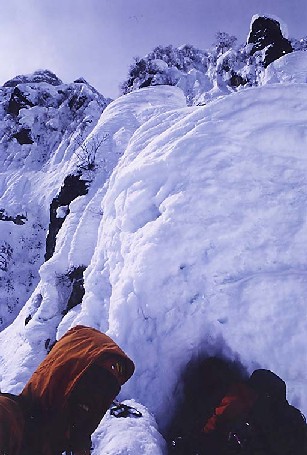 やむ終えず直登。 岩峰の上に出ている木にアブミをかけ強引に這い上がるが被っていおり岩の上は垂直の雪壁でゲキ悪! ダブルアックスを抜け口に叩き込み、頭で雪を崩して何とか岩の上に立つも際どいバランスを強いられる。 この雪壁もグサ雪で全然立ち込めない為、雪を崩して中の萌木を掘り出して攀じ上がるが表面が硬い為気が遠くなるような作業となる。 途中からスコップを上げ萌木にセルフを取って掘り返すが一向に進まない。 雪壁の抜け口はキノコになっていたが、さすがに掘り崩すのもおっくうになり最後はバイルを突き刺し強引に腕力だけで這い上がる。 突き刺したバイルの雪が崩れれば終わりだったが何とか突破! 20メートルに2時間近くかかってしまった。 ここでピッチを切るも幅1メートルほどのゲキヤセ尾根でビレイ用の木もない為、アックスとスノーバーを雪に突き刺し支点を取る。 更に行く手を阻むかのように巨大なキノコが目の前に座っている。