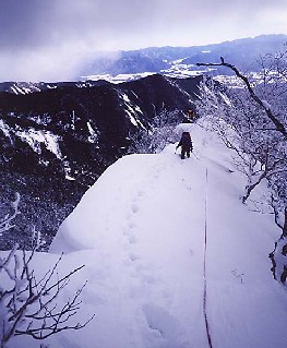 1月31日 東面は晴れているが稜線上は雲が流れている。 寒気団が流れ込んでいるのは間違いないようだ。北アはかなり吹雪いているだろう。 テントを撤収し尾根を詰めていくが結構ラッセルが深くなる。 途中ヤバそうなところはザイルを出し、交代しながら進むが幕営地から見えていた五段の宮はなかなか見えない。 ルンゼみたいな斜面をアックスと前ツメを効かせながら上がるとようやく五段の宮の直下に出る。 手前のリッジもキノコ尾根のようになっていた為、ここでロープを出し取り付きまで。