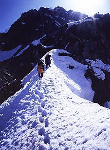 ![]() 断壁手前の雪稜をゆく |